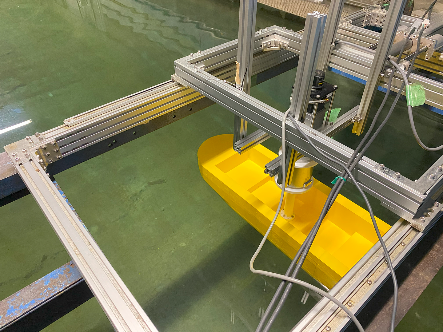 回流水槽に検力計を設置し、これにロボット漁船のストラットを取り付けます。回流水槽で流れを起こし、ストラット角度を変えるとともにプロペラも制御して検力を行っていきます。これもデータベース化していきます。