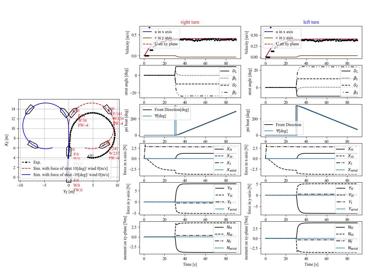 必要な流体力をデータベース化しましたので、最後に操縦運動方程式を解き、ロボット漁船の操船シミュレーションを行っていきます。風や流れは任意に与えられるようにして、運動方程式の外力項に加えてシミュレーションします。