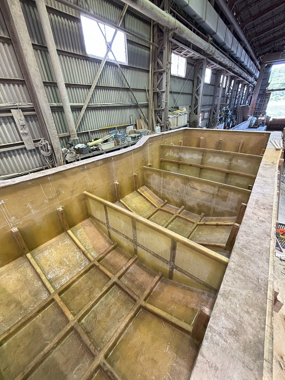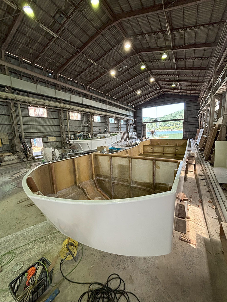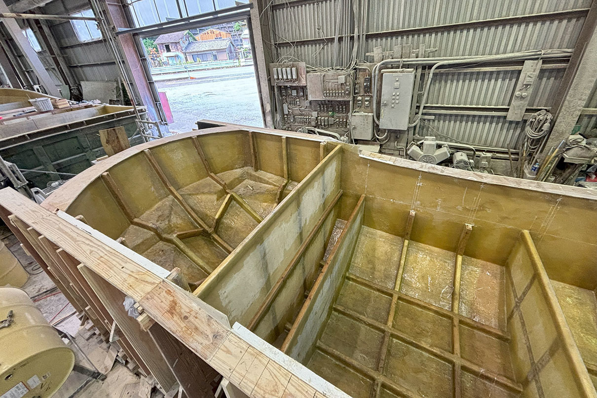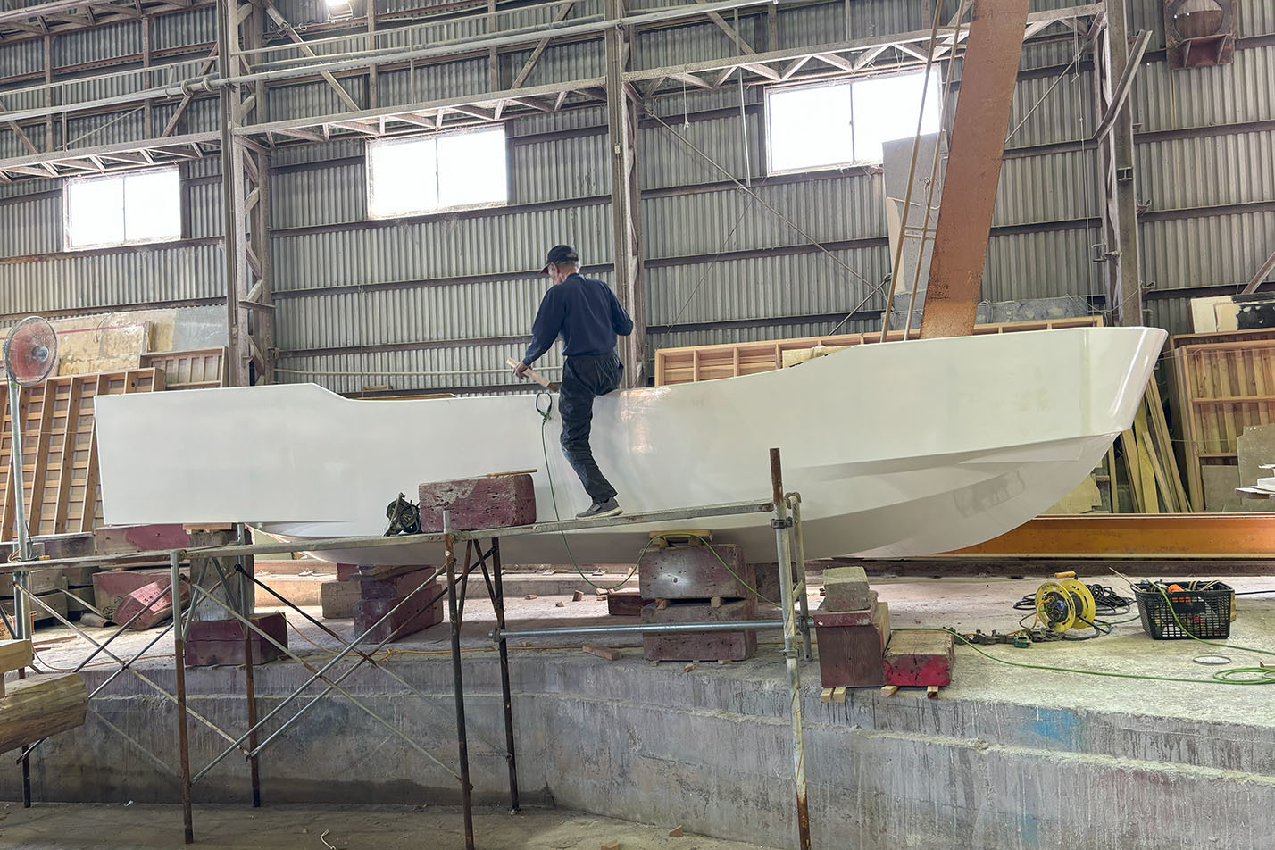 2024年 ロボット漁船7m実証機 -Robo Sailing ZERO- の製造 きりゅう造船にて製造 型製造中 型製造中 ゲルコート ゲルコート塗付 ゲルコート塗付 積層 積層 積層 脱型 脱型 脱型 内装 餌箱 内装 ストラット ストラット ストラット バッテリー デッキ 操舵機 スラスター Robo Sailing ZERO MEMORYに戻る。