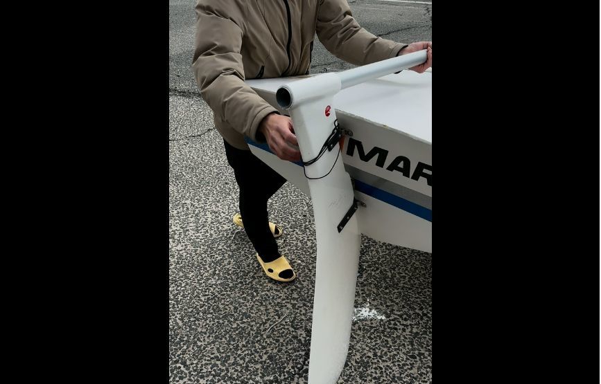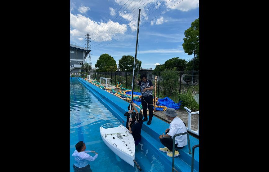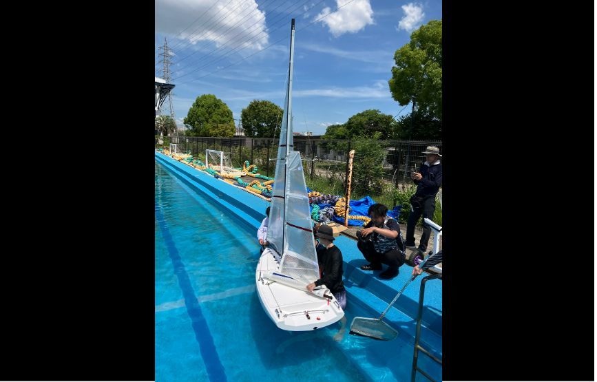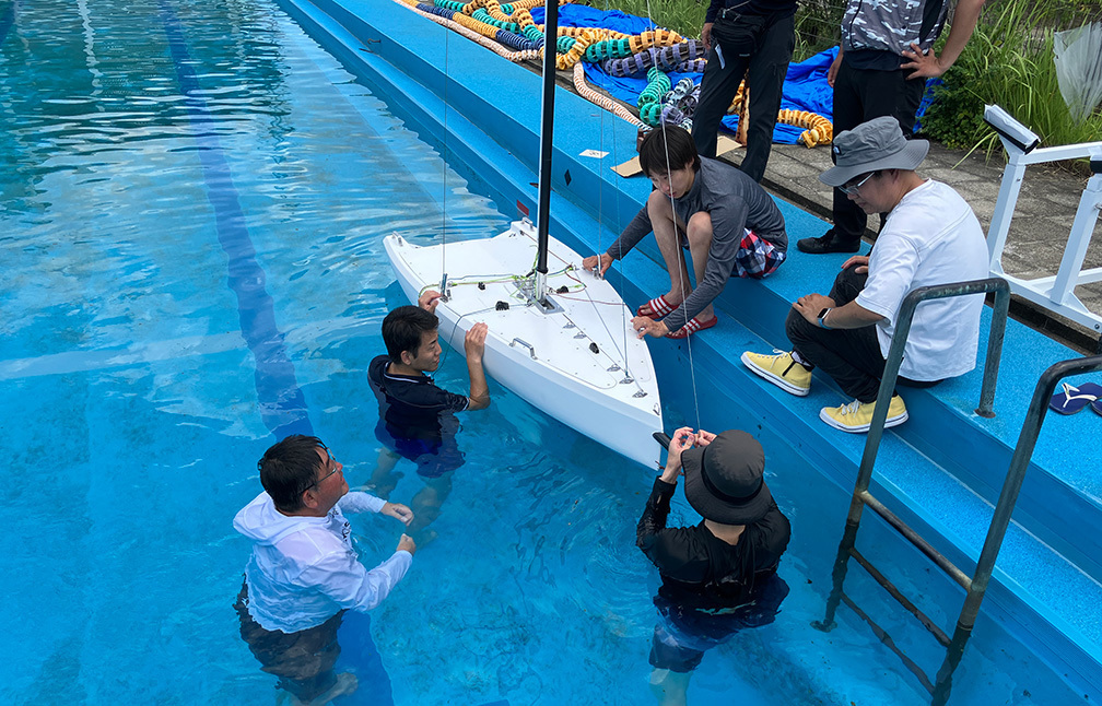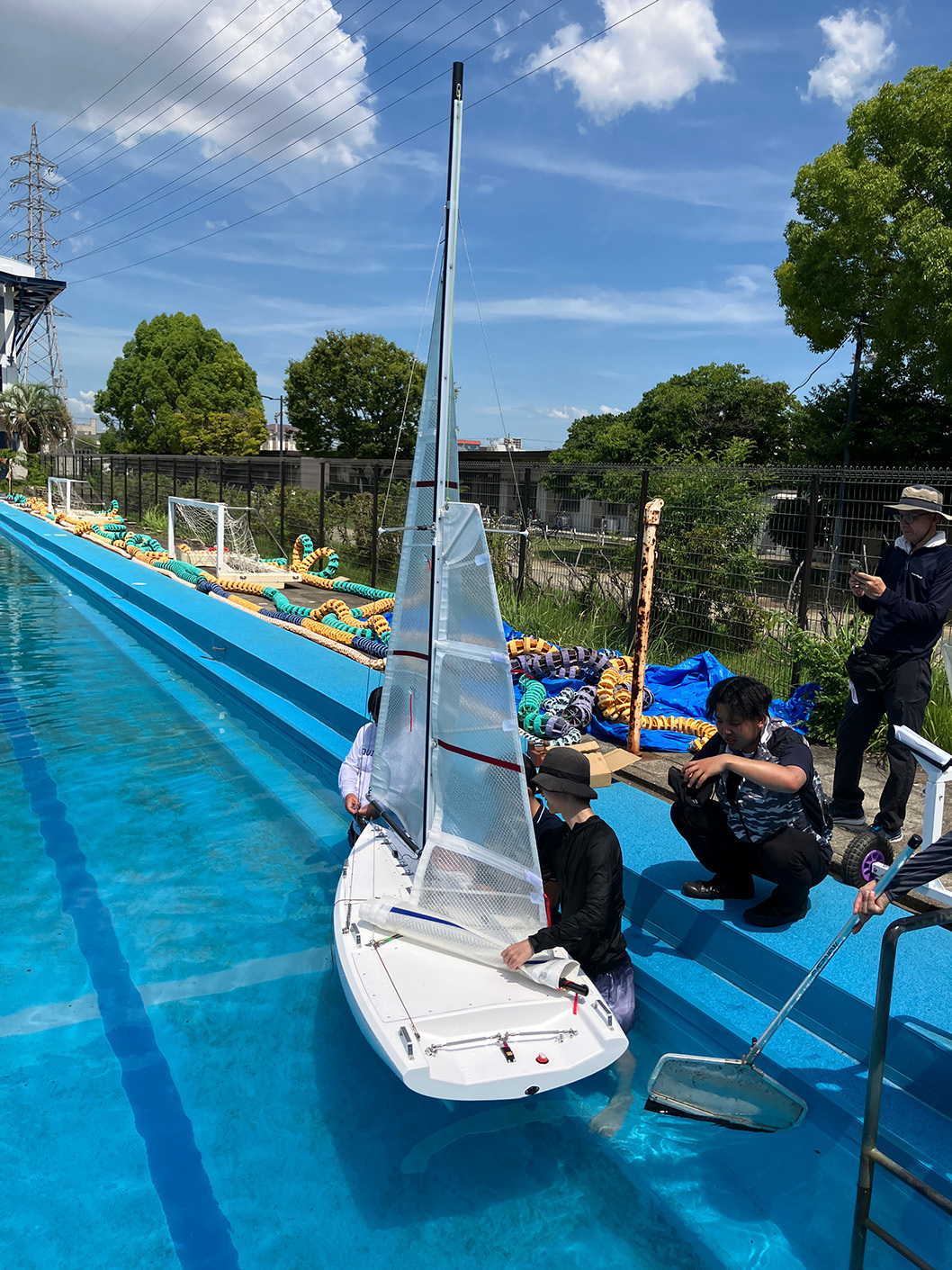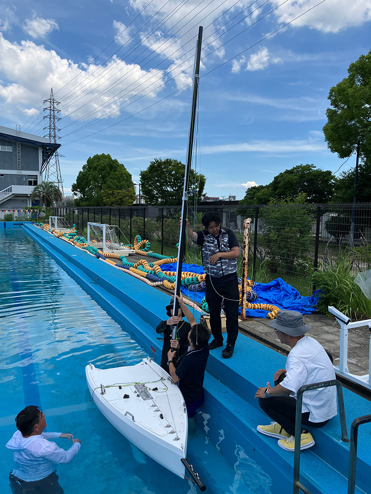 Polarisの本格的な航行の前に、艤装方法の確認、入水方法の確認、浸水の有無、帆走性能の手ごたえ、各種テンションの調整を行なう必要があります。大阪公立大学のプールでの試走をしました。